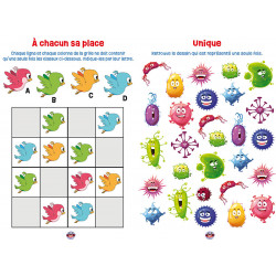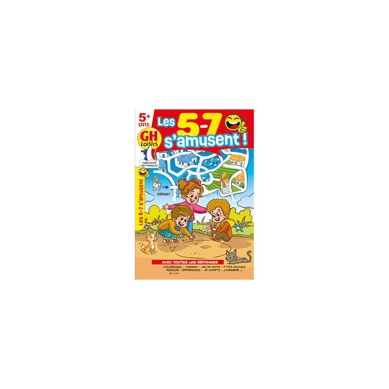 Les jeux proposés sont adaptés aux enfants de 5 à 7 ans : puzzle, dessin à points, labyrinthe, jeux de mots, différences et un maxi coloriage.